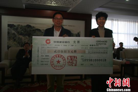 珠海市華策集團董事局主席楊峰(左)向中國文聯(lián)黨組書記、副主席趙實(右)捐贈2500萬元,用于翰墨薪傳·全國中小學書法教師培訓項目。