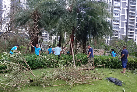“天鴿”離開(kāi)后,業(yè)主群里有人召集業(yè)主,呼吁大家一起當(dāng)義工,組織開(kāi)展清理小區(qū)及周邊道路倒伏樹(shù)木、廣告牌,盡早恢復(fù)小區(qū)原狀的行動(dòng)。得知業(yè)主的請(qǐng)求后,小區(qū)物業(yè)公司安排了專門人員與業(yè)主共同開(kāi)展行動(dòng),并提供了礦泉水、防割手套、清潔工具等用品。經(jīng)過(guò)災(zāi)難的洗禮,無(wú)論是物業(yè)工作人員,還是業(yè)主,大家心中都增添了幾分陽(yáng)光。6棟業(yè)主“北極星”在微信群里說(shuō):“這次點(diǎn)贊下物業(yè)辛苦了,共建平安和諧小區(qū),不斷進(jìn)步。愿鄰居們都平安。”