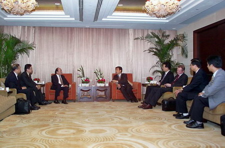 圖為:中山市委書記崔國潮(左四)于5月31日下午在中山香格里拉酒店會見考察團,常務副市長彭建文(左五)參加會見