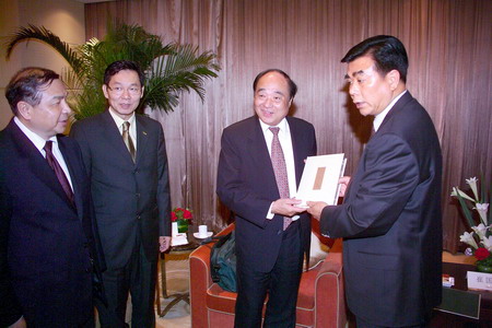 圖為:珠海市書記鄧維龍(右二)、副市長陳洪輝(右一)于6月1日下午在珠海度假村酒店會見考察團客人