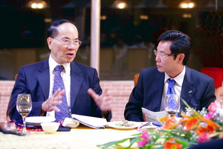 圖為:楊峰主席與臺灣林享能先生在宴會上交談
