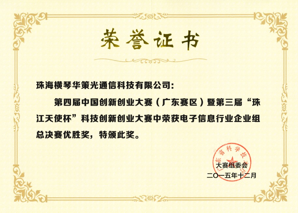 熱烈慶祝珠海橫琴華策光通信科技有限公司榮獲第四屆中國創(chuàng)新創(chuàng)業(yè)大賽優(yōu)勝獎發(fā)布時間: