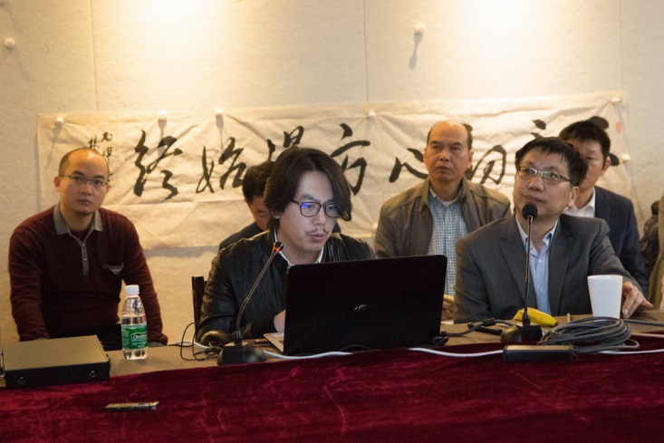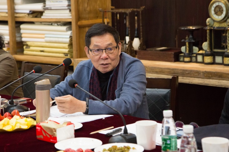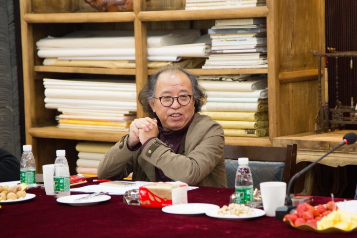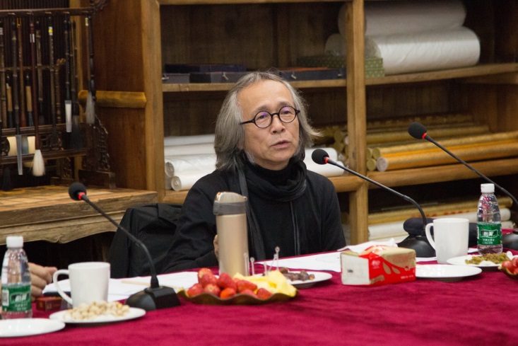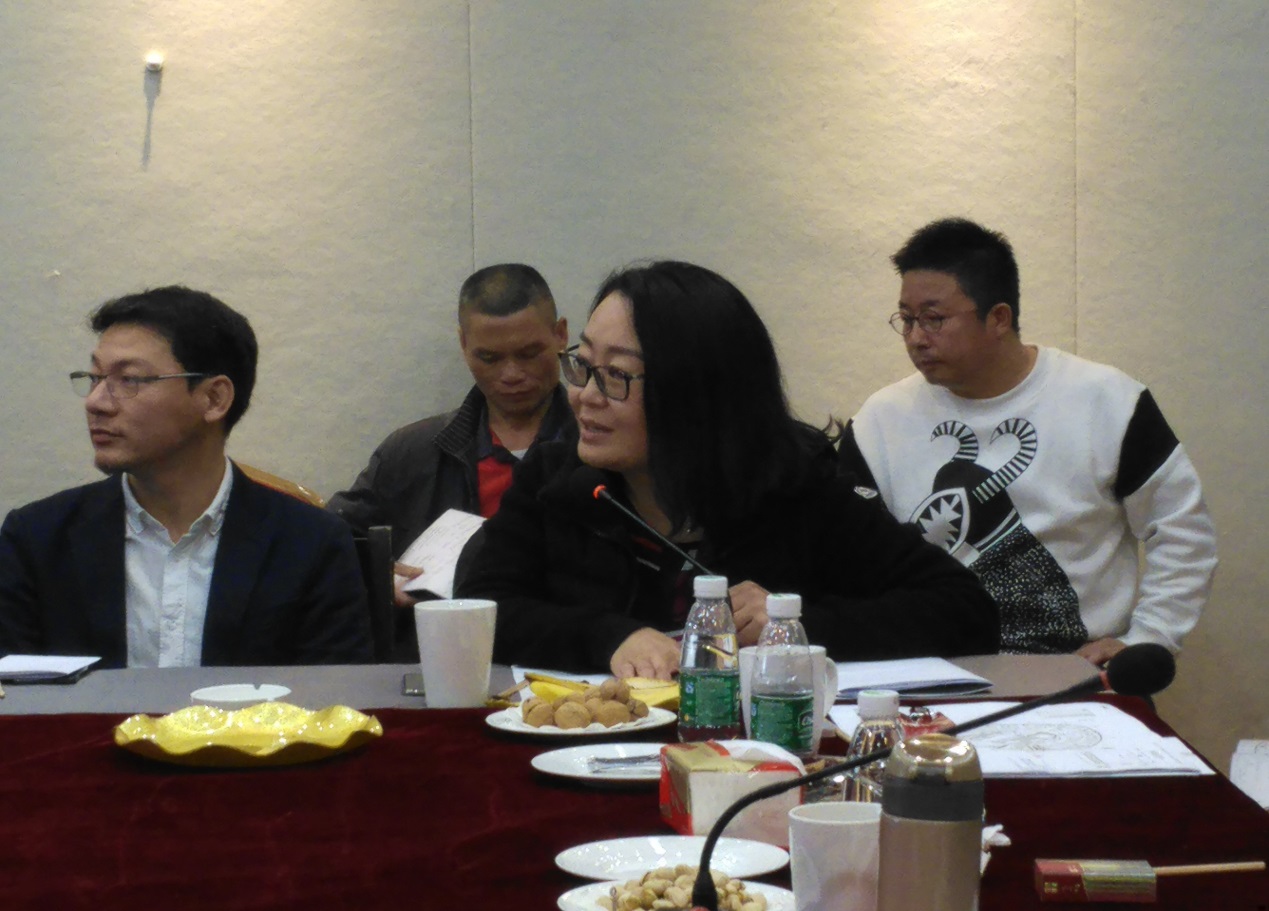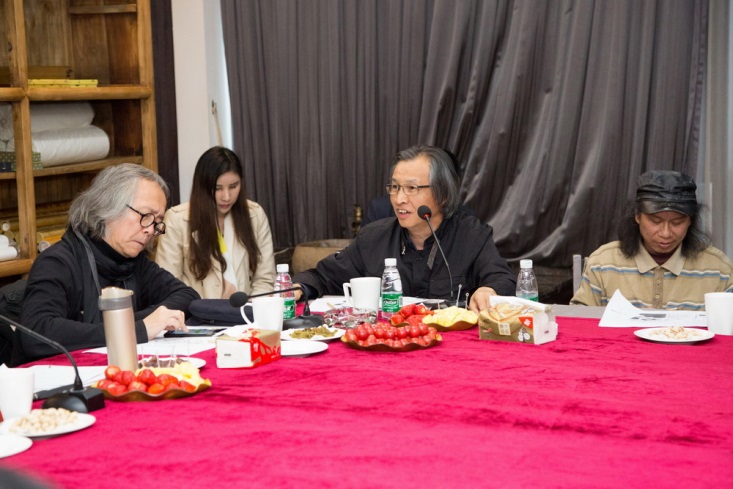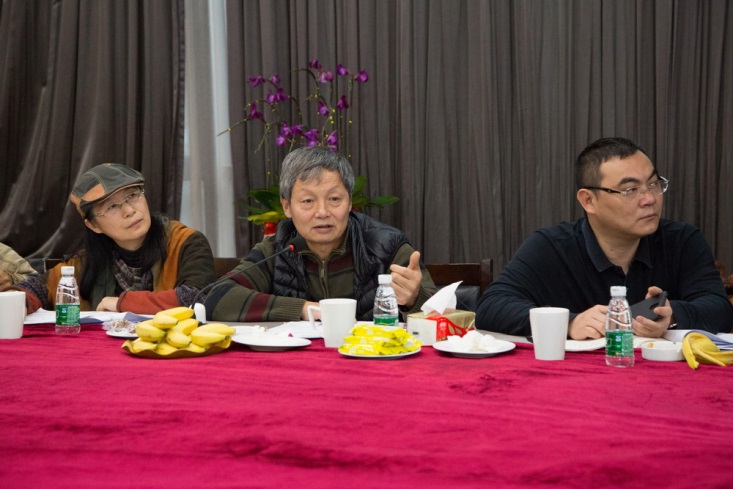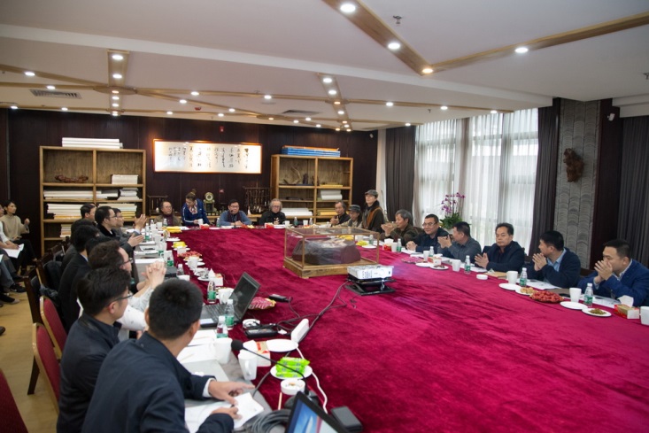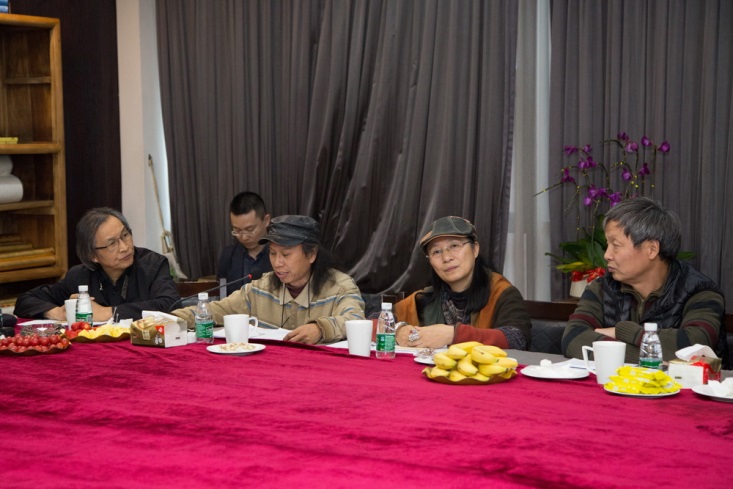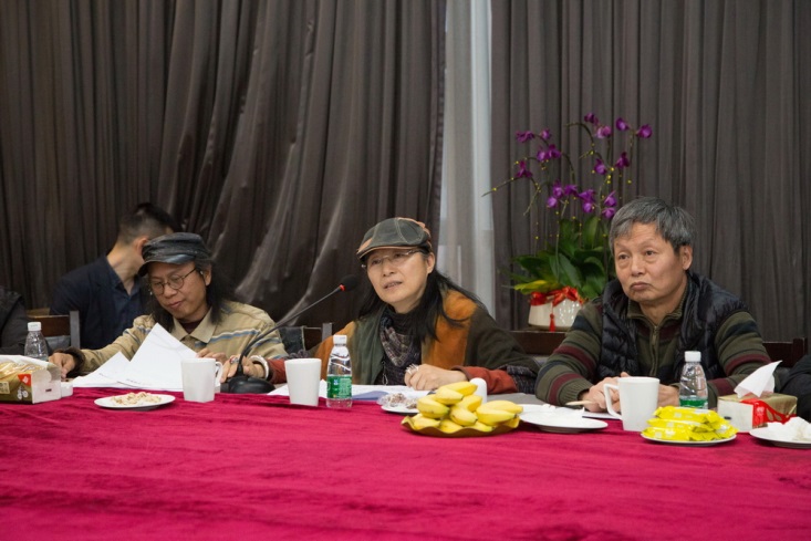 針對設計公司的方案,楊峰主席邀請胡寶利、趙健、張弘、李全民、石萍、紀光明6位藝術家給予點評和建議。藝術家們對主席辦公室屏風設計、燈光色彩搭配、茶室風格定位、水景效果、企業LOGO、室內光線、樓體綠植、國學區設計等問題各抒己見。