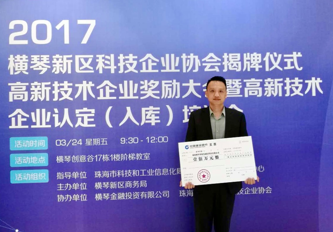 2017年3月24日,珠海橫琴華策光通信科技有限公司在“橫琴新區科技企業協會揭牌儀式、高新技術企業獎勵大會暨高新技術企業認定(入庫)培訓會”上,獲得政府專項獎金180萬元,其中橫琴新區獎勵100萬元,廣東省和珠海市獎勵80萬元。