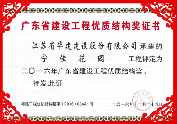 2017年6月16日,深圳寧佳花園項目(推廣名:華策中心城一期)榮獲“2016年廣東省建設工程優質結構獎證書”。這是該項目繼榮獲深圳市“安全生產與文明施工優良工地”獎、“2016年度上半年深圳市優質結構工程獎”及“第三屆深圳市建筑工程施工圖編制質量金獎”等獎項之后獲得的又一殊榮。