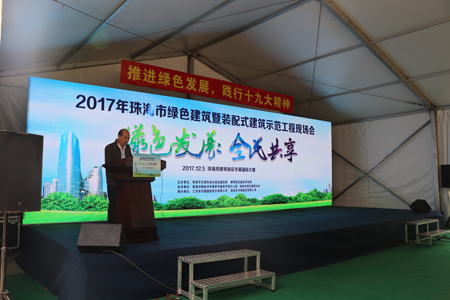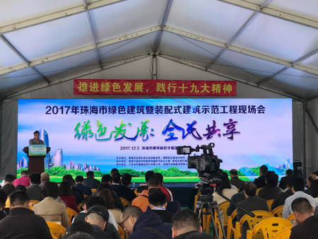 由珠海市住房和城鄉規劃建設局主辦、珠海市華策集團有限公司和江蘇省華建建設股份有限公司承辦、珠海市墻體材料革新和建筑節能辦公室以及珠海市綠色建筑協會參與協辦的“2017年珠海市綠色建筑暨裝配式建筑示范工程現場會”,于2017年12月5日在珠海市橫琴新區華策國際大廈成功舉行。