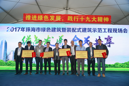 現場進行了2016~2017年度珠海市建筑節能及綠色建筑示范項目建設企業頒獎典禮,為這一年度獲得綠色建筑設計標識的10個單位頒發了示范項目牌匾和證書。獲獎單位為:珠海華達新能源科技有限公司、珠海奧華企業管理咨詢有限公司、珠海華發投資發展有限公司、珠海市政府投資項目建設監督管理中心、珠海欣業綠色能源科技有限公司、珠海藍琴發展有限公司、珠海市金灣區聯港基礎投資有限公司、珠海市橫琴新區勵盈房地產開發有限公司、珠海市萬潤置業發展有限公司、珠海市萬有引力房地產有限公司。此獎項的頒發為鼓勵各企業以建設生態環保城市為目標,大膽探索建設,發展綠色建筑。