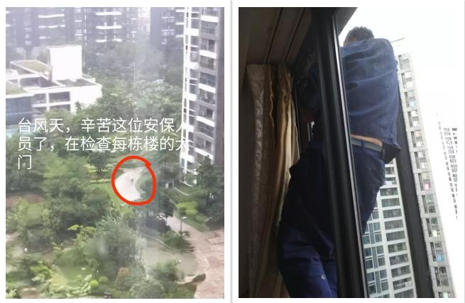 當天風雨最猛烈時,龍騰灣小區附近多個小區的玻璃窗戶被刮走,有些從高空墜落,小區的樹木被刮倒,對地面車輛和人員產生巨大安全隱患。此時,物業工作人員利用每個雨停的間隙第一時間手動清理各個小區路面。同時有組織有紀律地定時展開大范圍巡查排險,發現有未關嚴實的窗戶,就打電話聯絡業主,聯絡不上的,在停用電梯的情況下,保安徒步上樓敲門提醒。