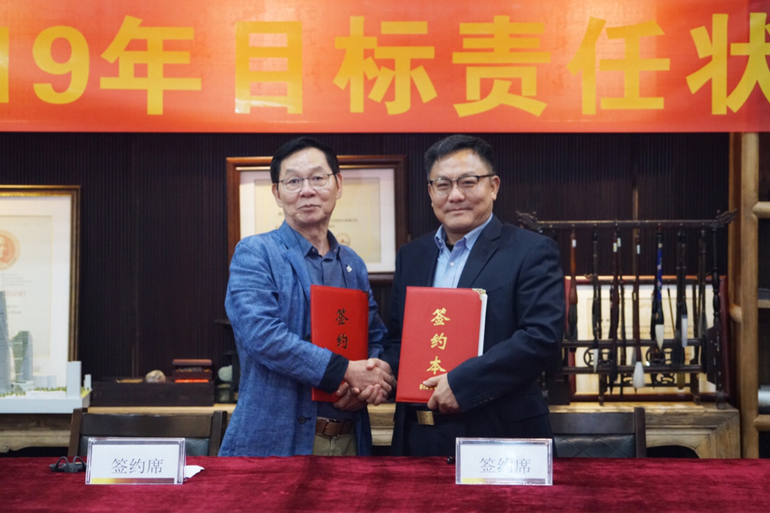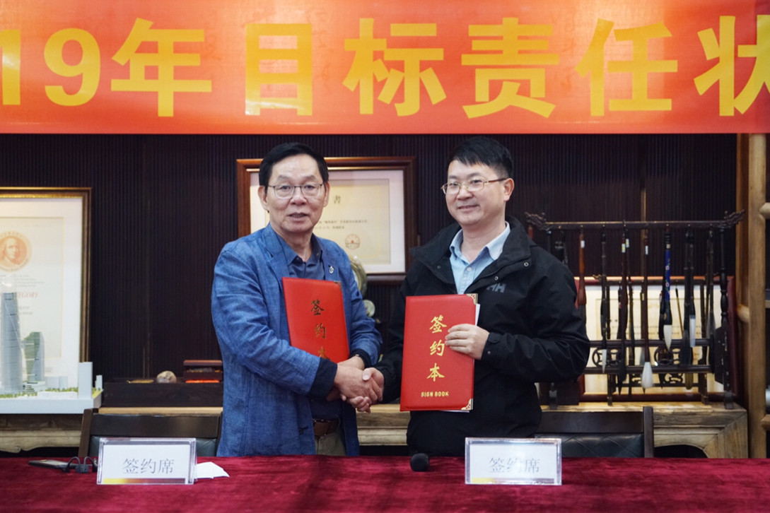 董事局主席楊峰(左)與董事常務副總裁梅合理()簽署責任狀