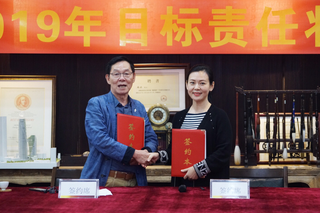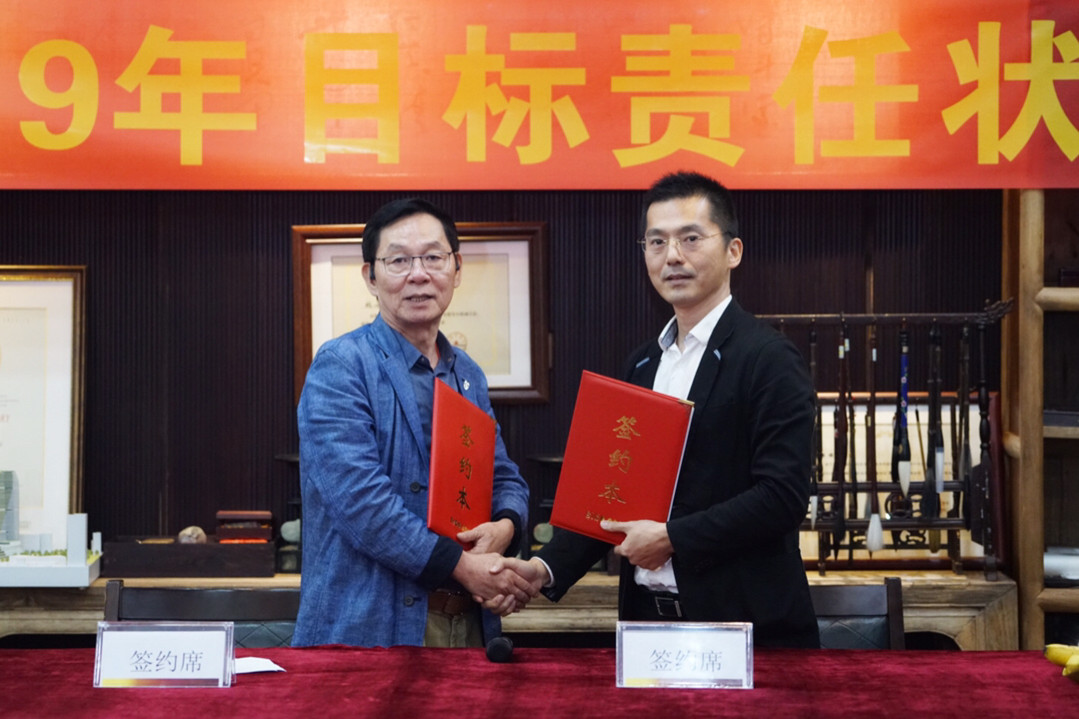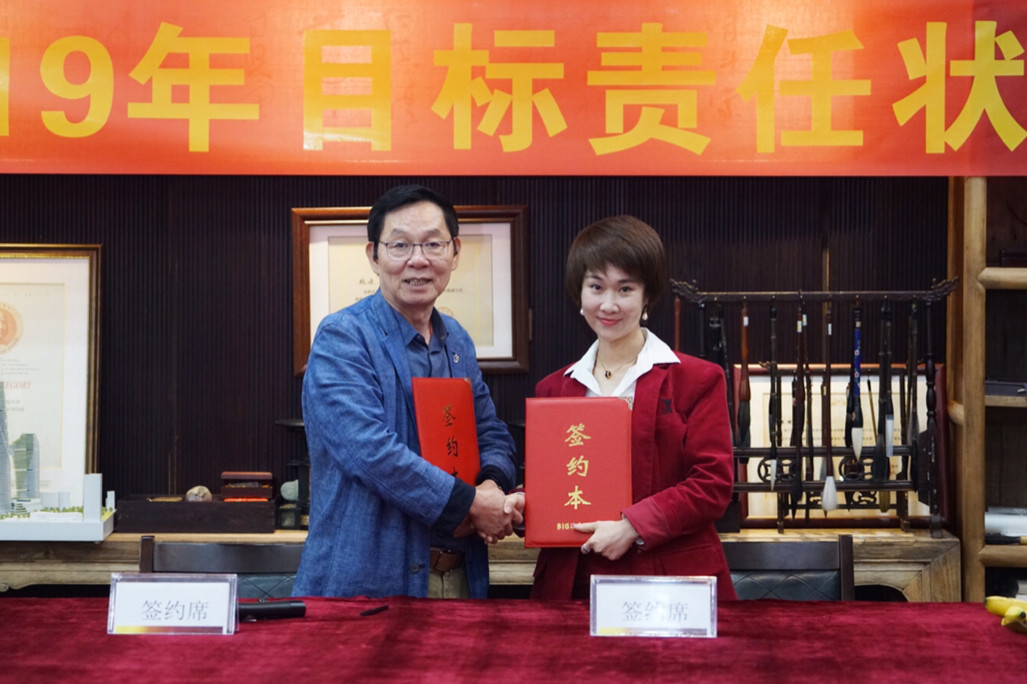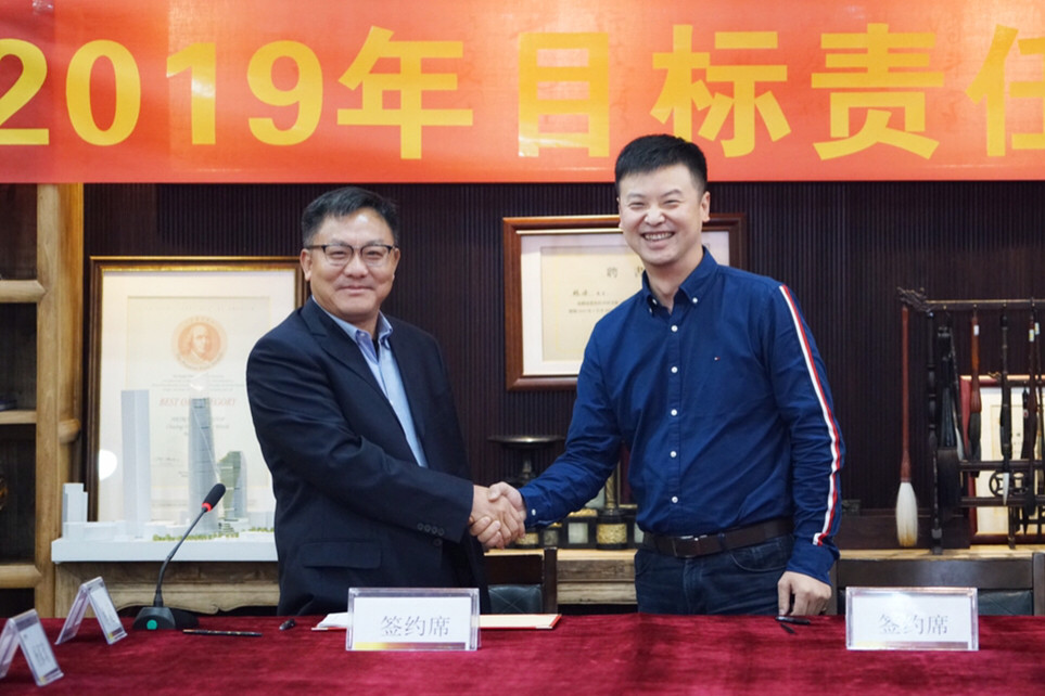 董事局主席楊峰(左)與集團營銷策劃中心策劃總監王曉飛(右)簽署責任狀