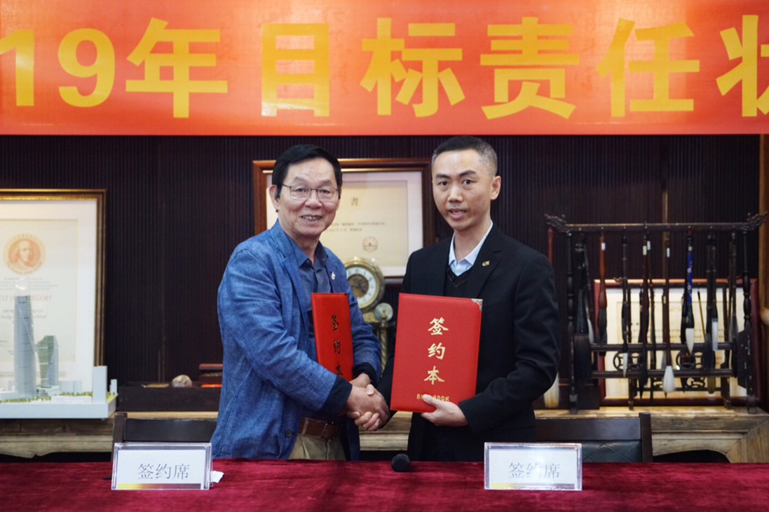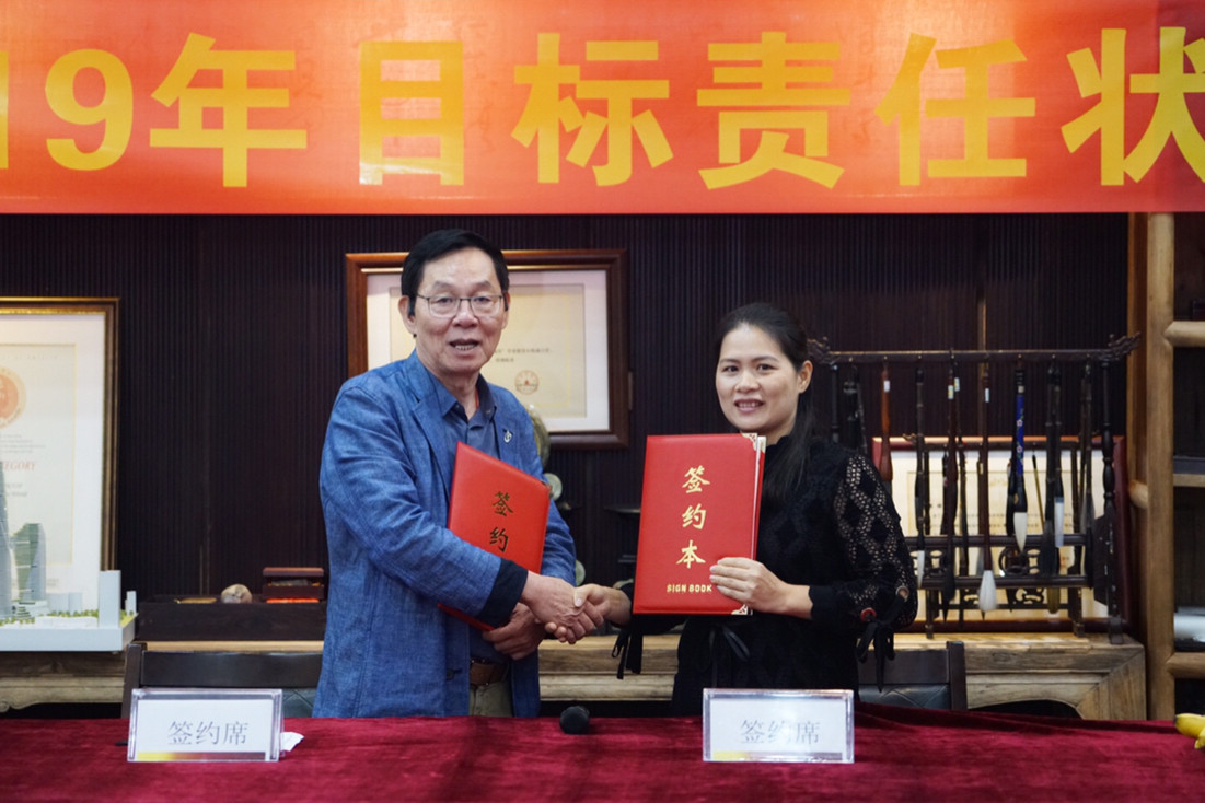 董事局主席楊峰(左)與集團銷售管理中心主任陳堅(右)簽署責任狀