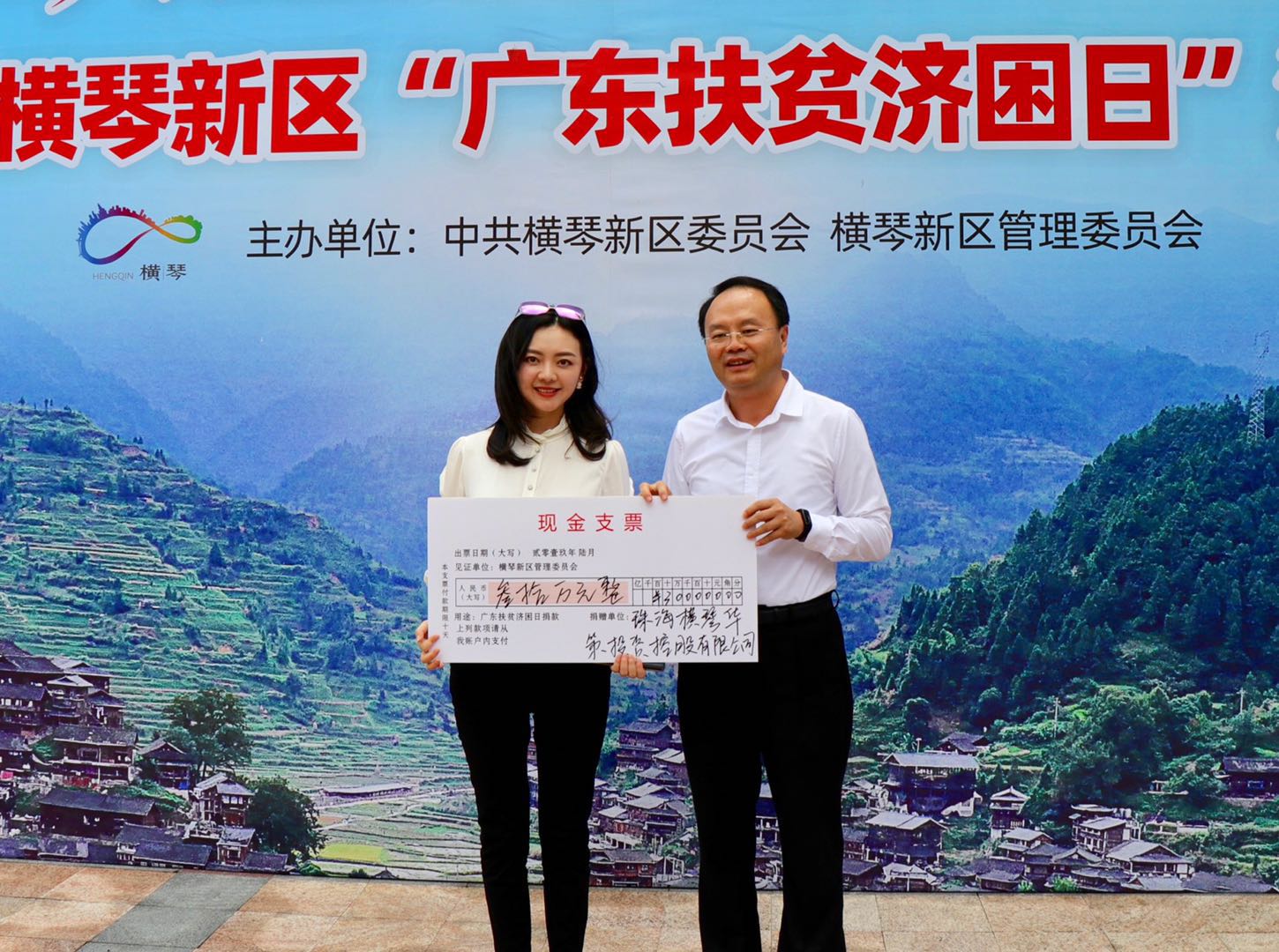 華策集團(tuán)行政副總監(jiān)田婷婷代表集團(tuán)捐贈(zèng)現(xiàn)金支票30萬(wàn)元