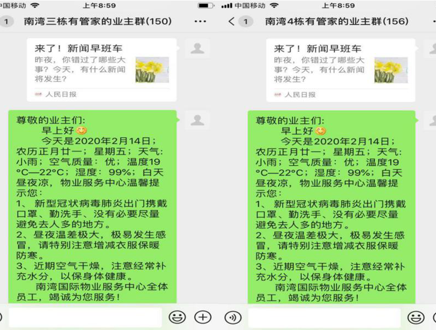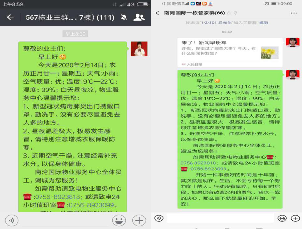 非常時(shí)期,健康人居成為每一個(gè)人安身立命之本,與疫情作戰(zhàn)就是在與時(shí)間賽跑。1月23日,大年二十九,“武漢封城”的信息傳來,自稱“小女生”的南灣國(guó)際公館物業(yè)項(xiàng)目副經(jīng)理王萍萍看著不斷被疫情刷新的微信群信息,心頭一緊,在收到疫情防控的工作要求后更是心慌意亂,不知如何是好,著急得哭了起來。過了一會(huì),王萍萍想了想,小區(qū)7棟居民樓的共計(jì)1485多居民的健康可不是小事,作為春節(jié)期間的物業(yè)負(fù)責(zé)人,在物業(yè)其他領(lǐng)導(dǎo)因疫情防控,暫時(shí)不能回來的情況下,必須獨(dú)自撐起來。