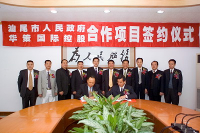 集團香港華策國際控股公司古少郁總經理與汕尾市外經貿局陳坎局長在協議上簽字