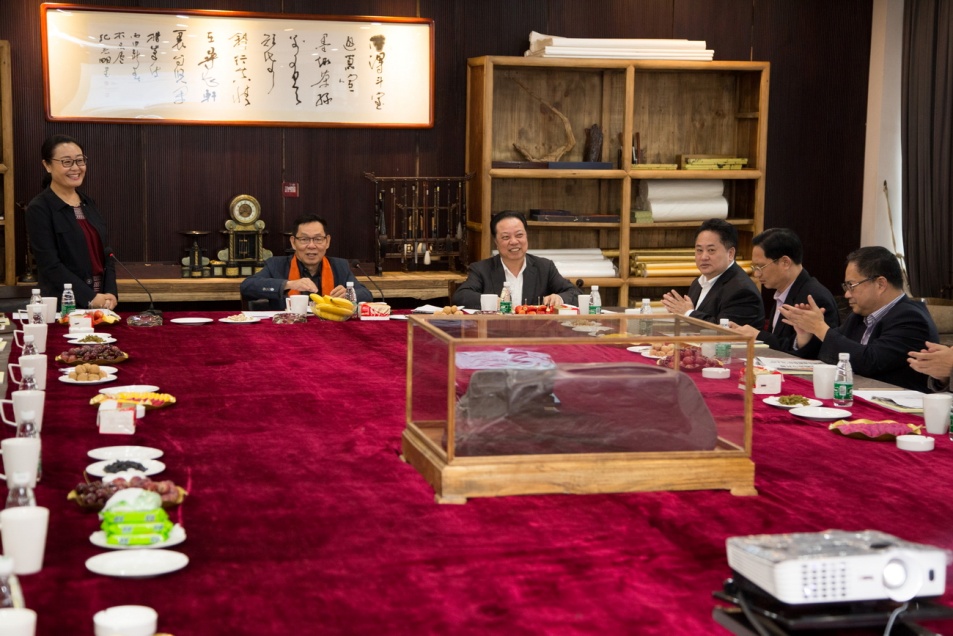 華策集團董事局主席楊峰對汕尾市政協領導的到來表示誠摯的歡迎。他強調,作為一個有使命感的陸豐客家人,他從來沒有忘記過家鄉,家鄉的一草一木,都讓他魂牽夢繞。這份感情就如同他創作的歌曲《故鄉的心田》所唱的,“故鄉有那青青的山,海陸連綿土地上,留有游子的一份心田,那就是鄉親的纏綿,為了一份心田,深耕細作是我的心愿……”。帶著對家鄉的深厚感情,楊峰主席向鄭佳主席一行介紹了華策集團的發展情況,他表示,作為一個從家鄉走出來的企業家,家鄉的發展和進步無時不在牽掛著他,同時表態,只要家鄉需要我,我一定會為家鄉的建設貢獻力量,在這個問題上,我本人以及我的繼承人都會義不容辭。