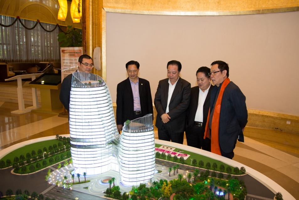 楊峰主席(右一)向客人介紹華策國際大廈項目